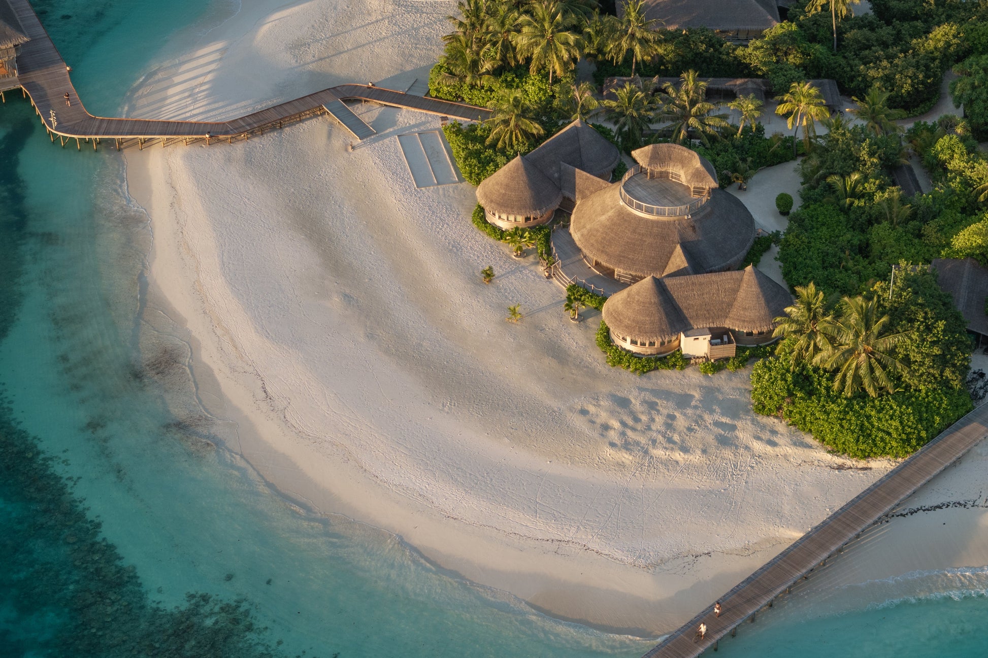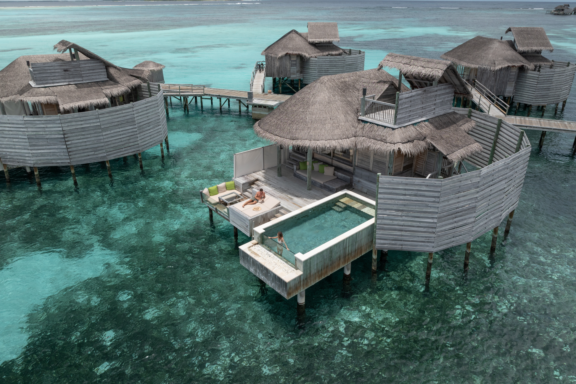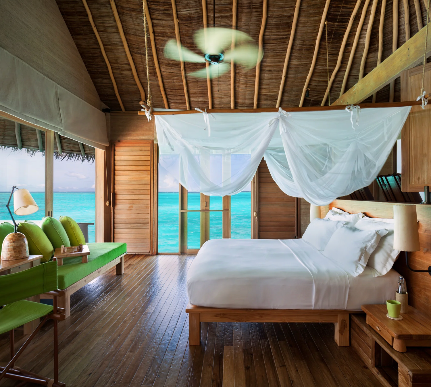 Getting to the resort is part of the adventure: from Malé International Airport, guests are escorted to the domestic terminal lounge, then board a 35-minute flight to Kadhdhoo Airport with breathtaking aerial views of the atolls, followed by a 15-minute speedboat ride to the resort arranged by your personal GEM (Guest Experience Maker).
