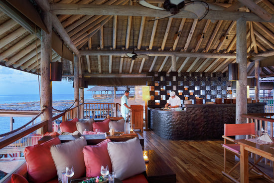 Located just meters from the house reef, Chill bar is where stories are written about morning snorkelers and retold over afternoon drinks. Signature cocktails wash ashore and are never left behind at this magical overwater setting built over several levels.