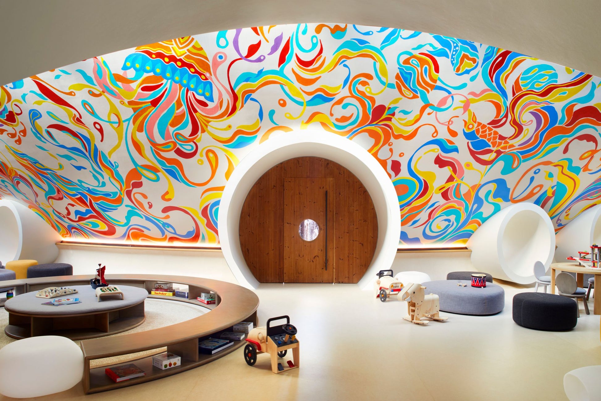 - Minimalist, circular-inspired modern architecture